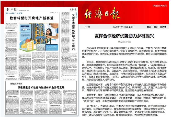 10月13日,《经济日报》刊发了我校中国合作社研究院院长秦立建教授的理论文章《发挥合作经济优势助力乡村振兴》。这一文章的发表恰逢联合国宣布的“2025国际合作社年”,在此背景下,全球范围内的合作社实践者与理论研究者正积极探索合作经济的新模式与新路径。该文章的发表及时回应了国际社会的普遍关切,彰显了我校在合作经济领域研究的学术底蕴与影响力。这也是本年度,中国合作社研究院在获得国家自然科学基金项目立项突破之后的又一重要科研成果。